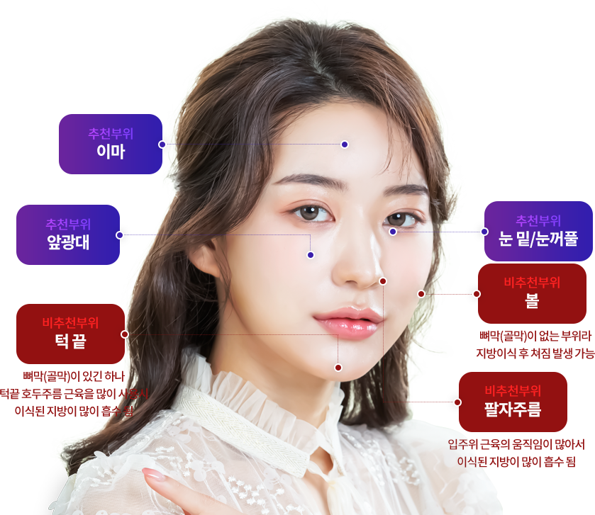 | 피부 층별로 균일하게 초미세지방 삽입 부작용이 거의 없음 |